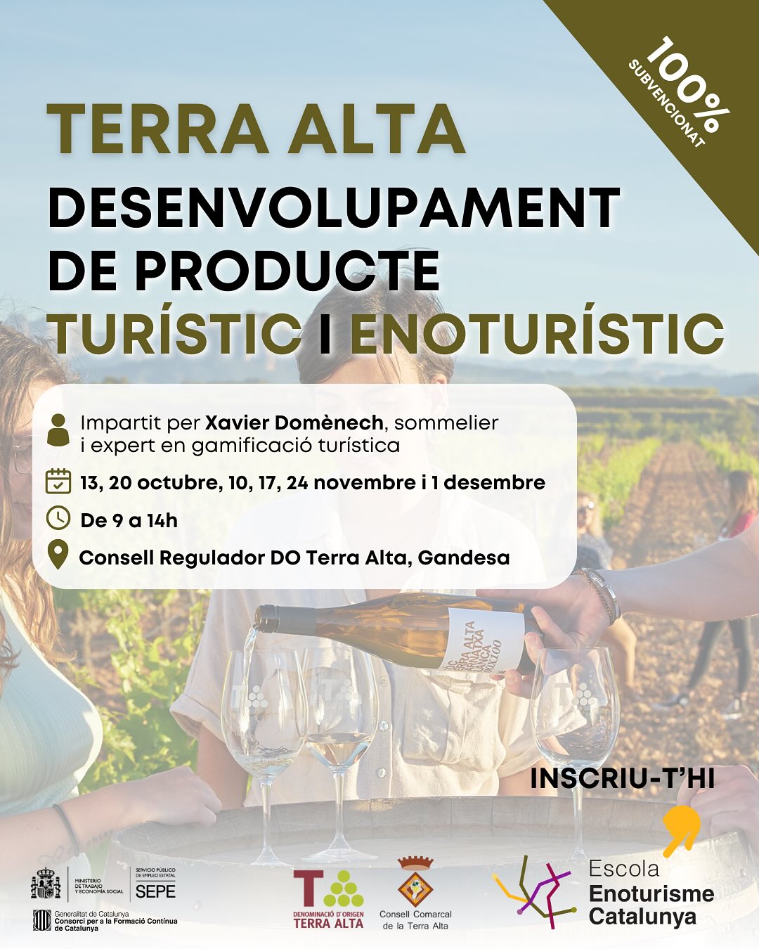 L’Escola d’Enoturisme de Catalunya, amb la col·laboració del Consell Comarcal de la Terra Alta i la DO Terra Alta, presenten aquest curs eminentment pràctic que ha de permetre, a partir de la reflexió estratègica que proporcionen les eines del màrqueting, dissenyar un producte turístic implementant les eines bàsiques de la gamificació com a estratègia per augmentar l’interès i la satisfacció dels clients.