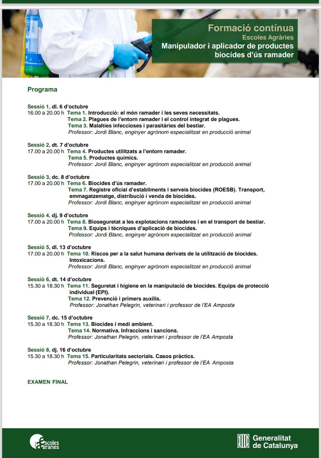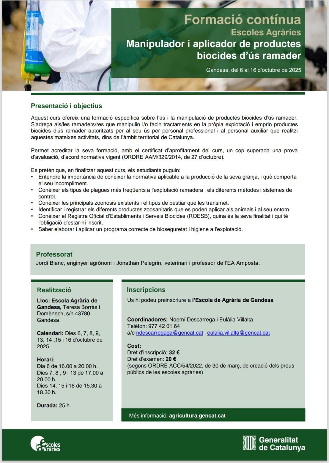 Formació contínua de les escoles agràries sobre MANIPULADOR I APLICADOR DE PRODUCTES BIOCIDES D’ÚS RAMADER