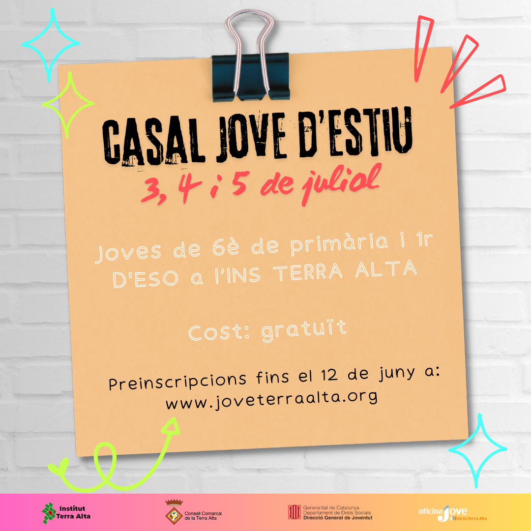 Atenció! S’ha obert el període de preinscripcions al Casal Jove d'estiu per aquest 2024! CASAL JOVE D'ESTIU Destinatàries: alumnat de 6è de primària i 1r d'ESO de la Terra Alta [...]